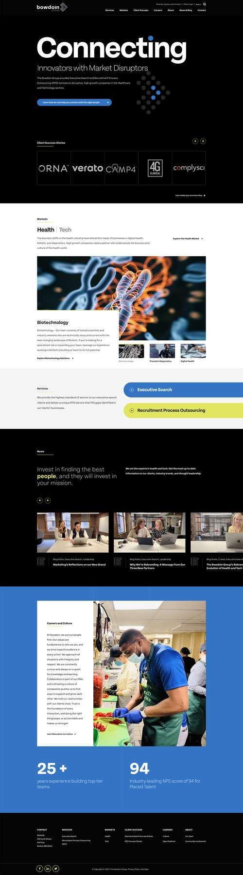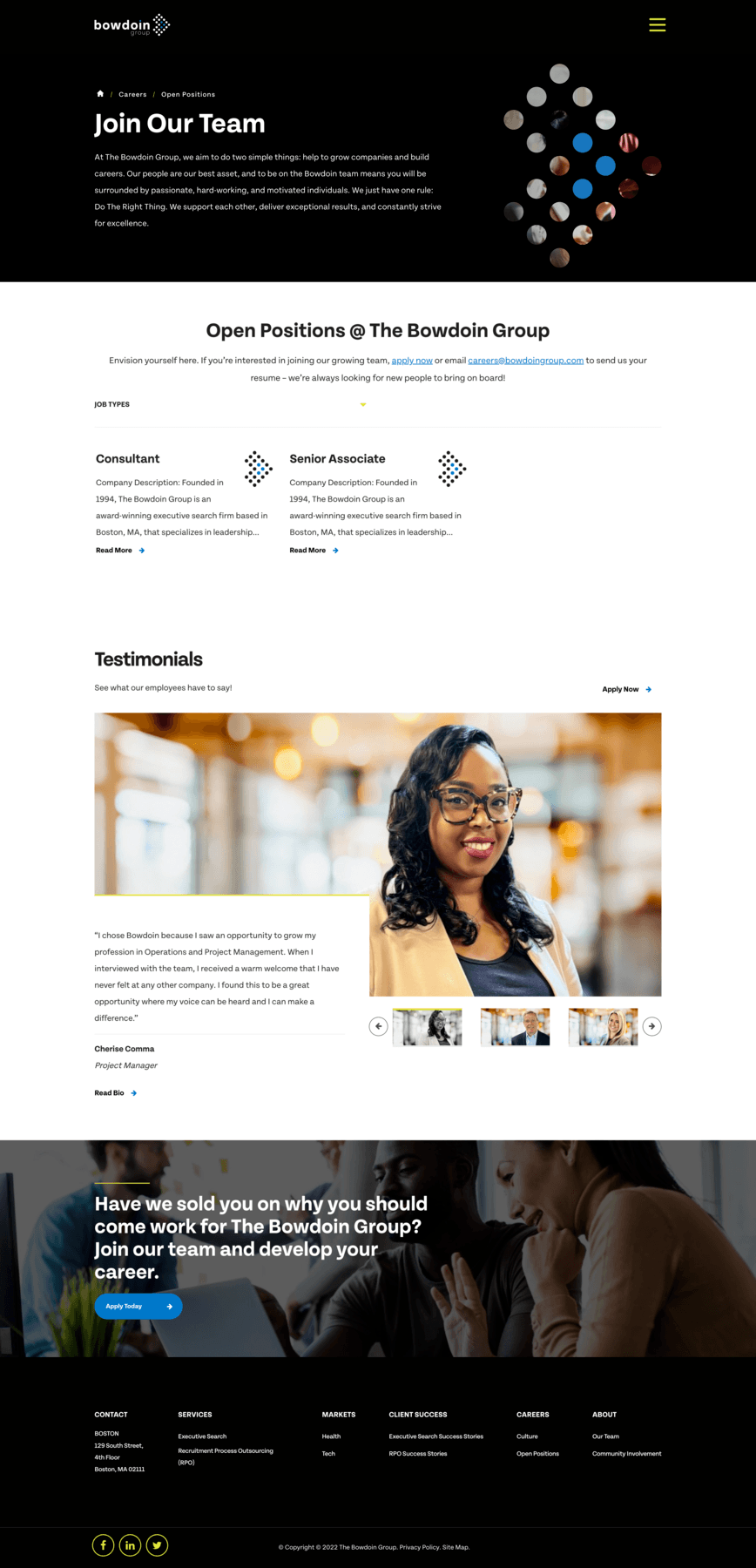 The emagine team redesigned and transformed The Bowdoin Group site to stand out in the saturated recruitment market, and to show that they are market disruptors who recruit and place the best, top-tier candidates. The site also stands out from a design perspective, using a dark color scheme and bold, impactful formatting. The emagine team pulled through the distinct Bowdoin logo throughout the site, using it in animation and messaging.