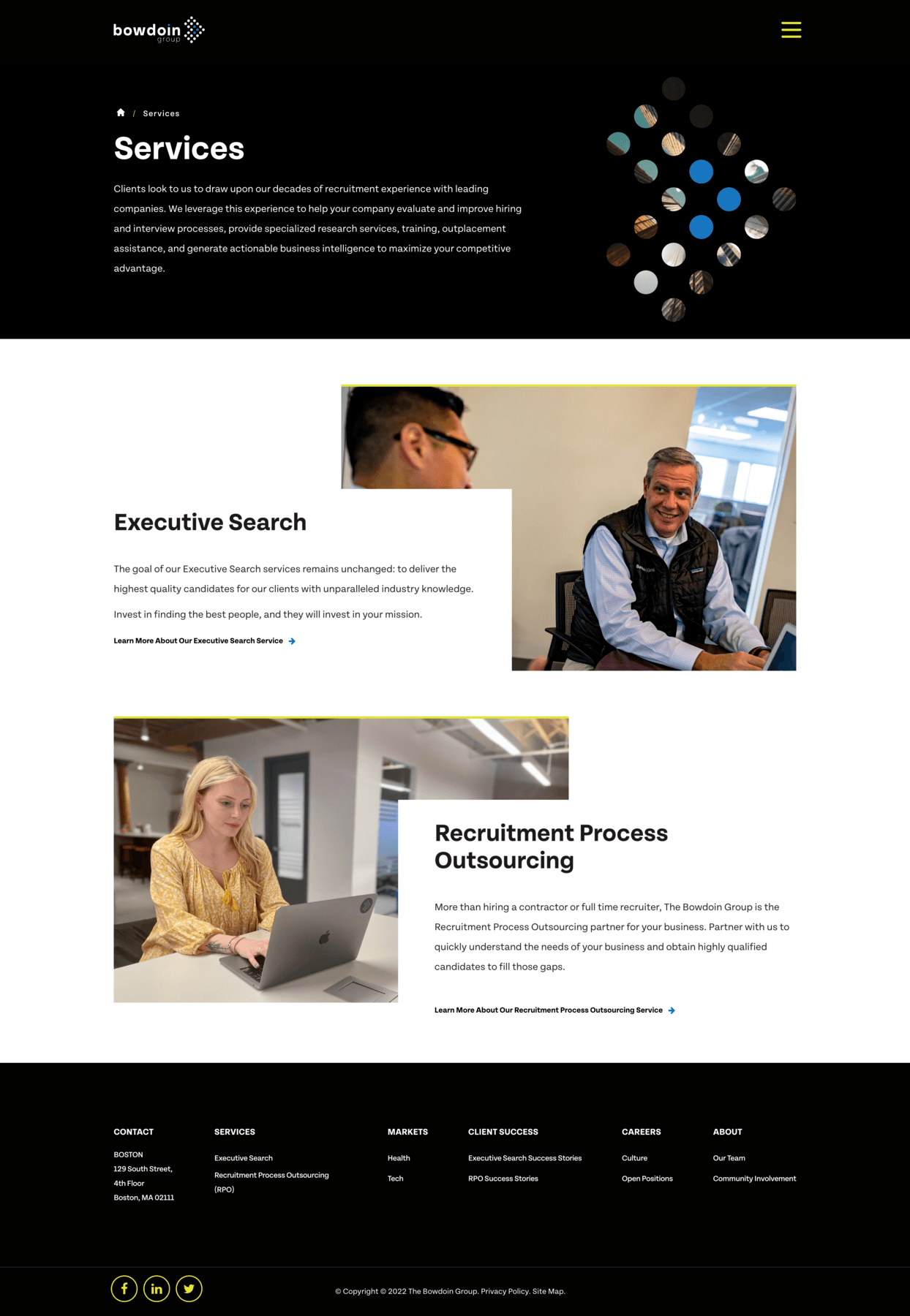 Another significant component of the site was to feature the companies and brands that Bowdoin has worked with to demonstrate their credibility and renown consistently throughout the site. The Client Success Stories section was designed to showcase these reputable companies, filtered by category for improved usability. Applicable clients show up in relevant areas across the site, targeted by industry.
